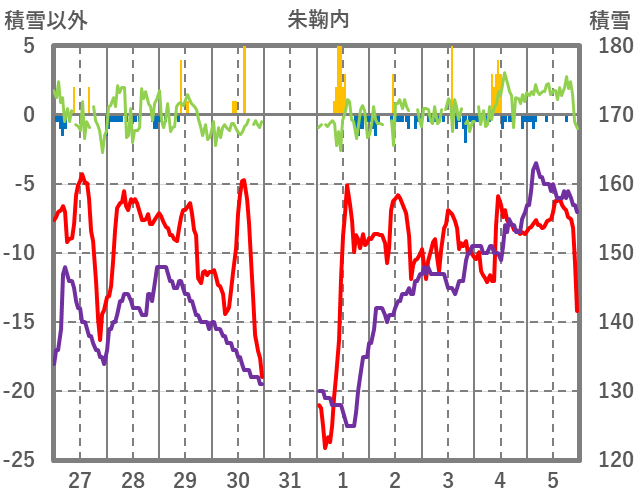 | 日 | 時 | 気温 | 降水 | 風向/風速 | 日照 | 積雪 | 降雪 |