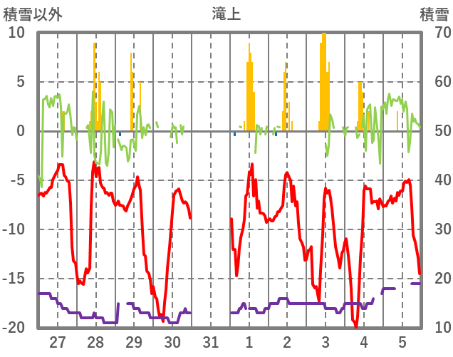 | 日 | 時 | 気温 | 降水 | 風向/風速 | 日照 | 積雪 | 降雪 |