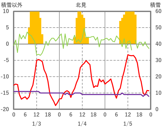 | 日 | 時 | 気温 | 降水 | 風向/風速 | 日照 | 積雪 | 降雪 |