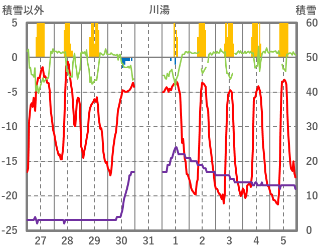 | 日 | 時 | 気温 | 降水 | 風向/風速 | 日照 | 積雪 | 降雪 |