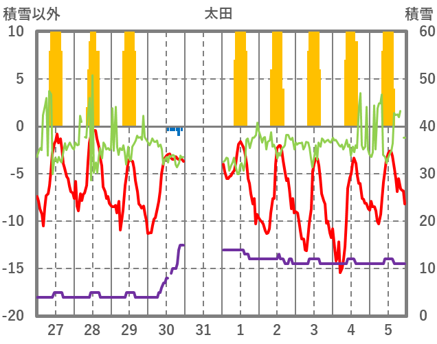| 日 | 時 | 気温 | 降水 | 風向/風速 | 日照 | 積雪 | 降雪 |