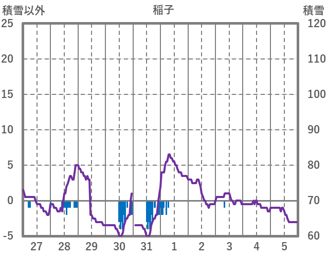 | 日 | 時 | 気温 | 降水 | 風向/風速 | 日照 | 積雪 | 降雪 |