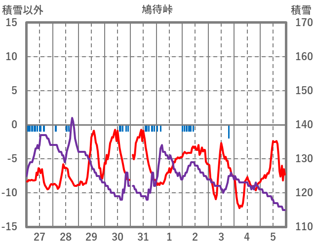 | 日 | 時 | 気温 | 降水 | 風向/風速 | 日照 | 積雪 | 降雪 |