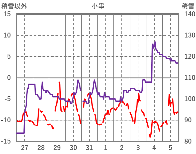 | 日 | 時 | 気温 | 降水 | 風向/風速 | 日照 | 積雪 | 降雪 |
