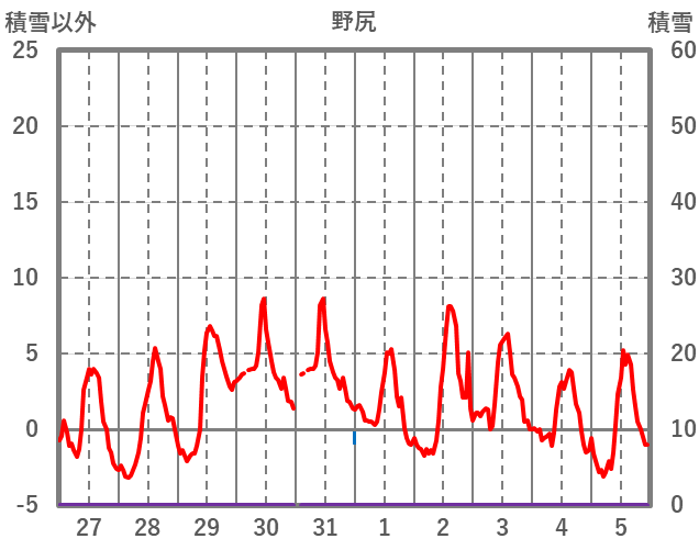 | 日 | 時 | 気温 | 降水 | 風向/風速 | 日照 | 積雪 | 降雪 |