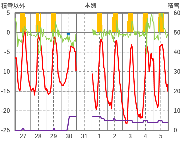 | 日 | 時 | 気温 | 降水 | 風向/風速 | 日照 | 積雪 | 降雪 |