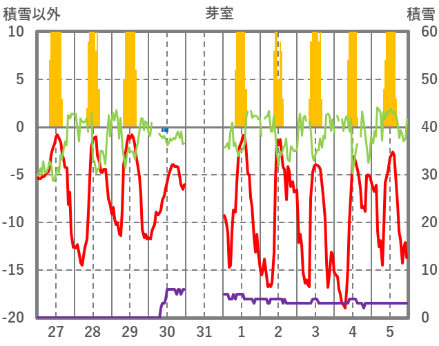 | 日 | 時 | 気温 | 降水 | 風向/風速 | 日照 | 積雪 | 降雪 |