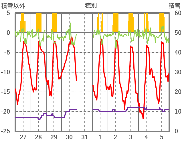 | 日 | 時 | 気温 | 降水 | 風向/風速 | 日照 | 積雪 | 降雪 |