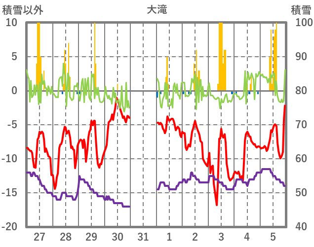 | 日 | 時 | 気温 | 降水 | 風向/風速 | 日照 | 積雪 | 降雪 |