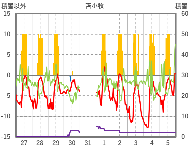 | 日 | 時 | 気温 | 降水 | 風向/風速 | 日照 | 積雪 | 降雪 |