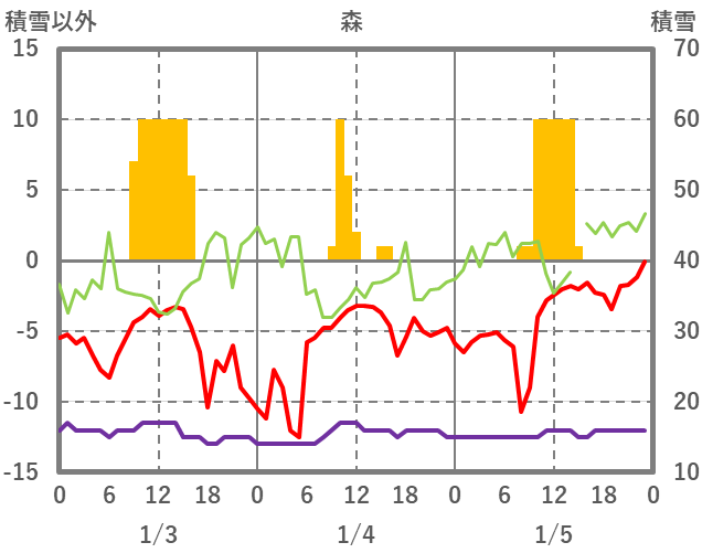 | 日 | 時 | 気温 | 降水 | 風向/風速 | 日照 | 積雪 | 降雪 |