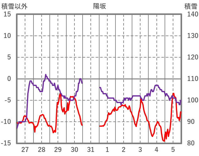 | 日 | 時 | 気温 | 降水 | 風向/風速 | 日照 | 積雪 | 降雪 |