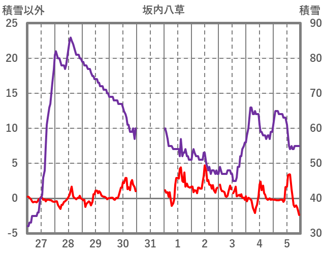 | 日 | 時 | 気温 | 降水 | 風向/風速 | 日照 | 積雪 | 降雪 |