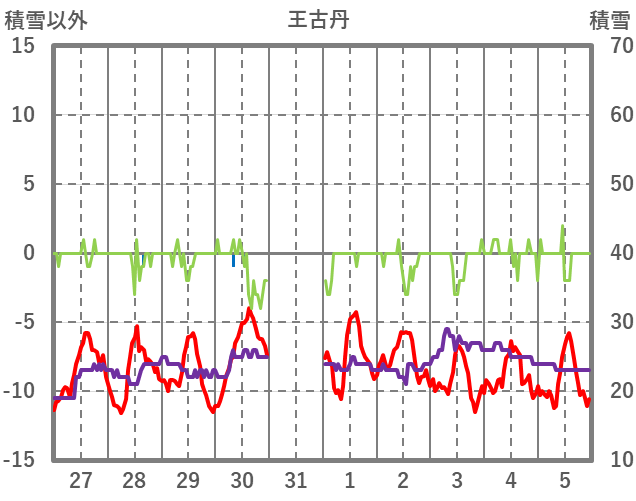 | 日 | 時 | 気温 | 降水 | 風向/風速 | 日照 | 積雪 | 降雪 |