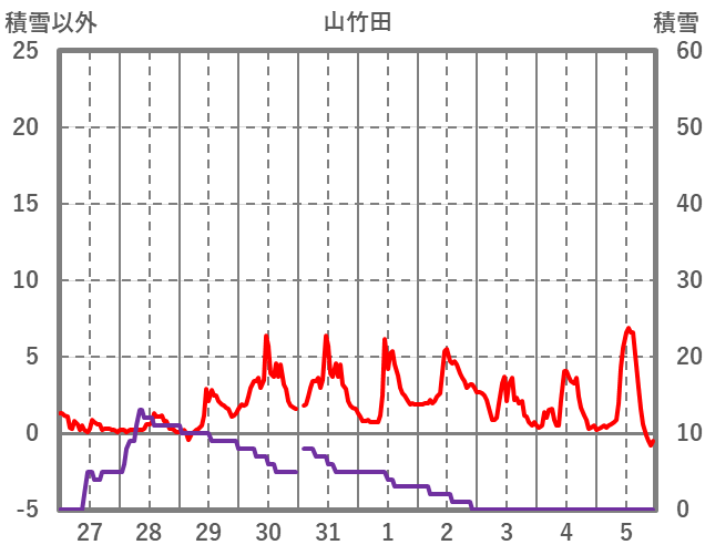 | 日 | 時 | 気温 | 降水 | 風向/風速 | 日照 | 積雪 | 降雪 |