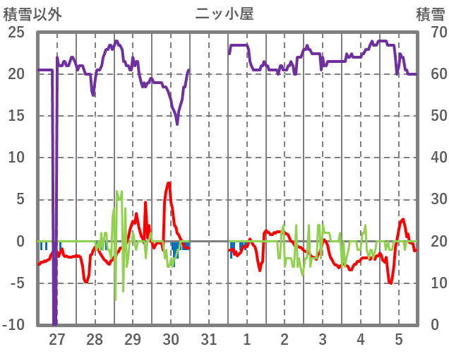 | 日 | 時 | 気温 | 降水 | 風向/風速 | 日照 | 積雪 | 降雪 |