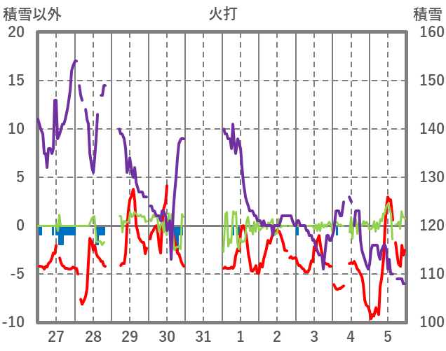 | 日 | 時 | 気温 | 降水 | 風向/風速 | 日照 | 積雪 | 降雪 |