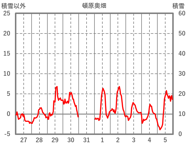 | 日 | 時 | 気温 | 降水 | 風向/風速 | 日照 | 積雪 | 降雪 |