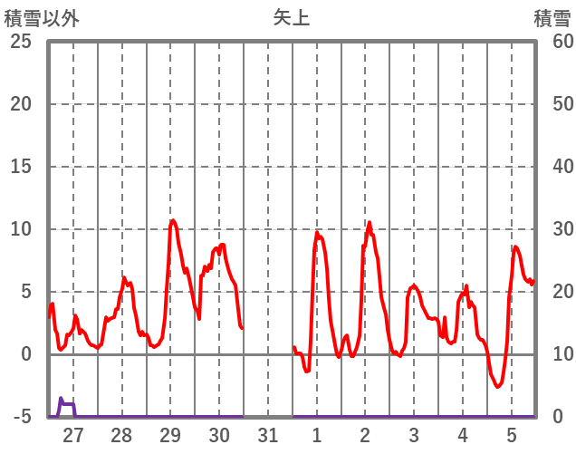 | 日 | 時 | 気温 | 降水 | 風向/風速 | 日照 | 積雪 | 降雪 |