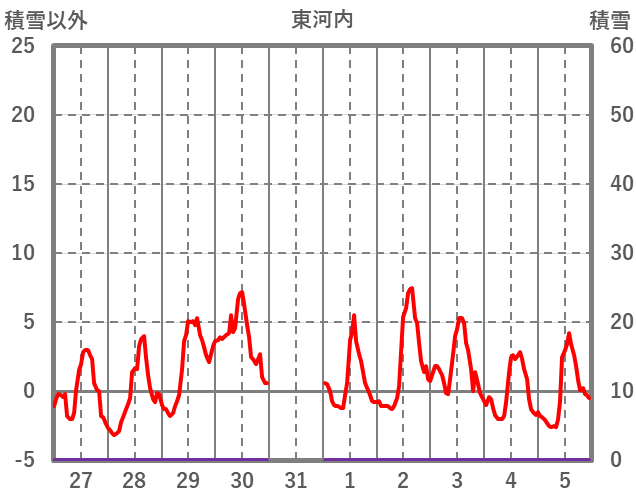 | 日 | 時 | 気温 | 降水 | 風向/風速 | 日照 | 積雪 | 降雪 |