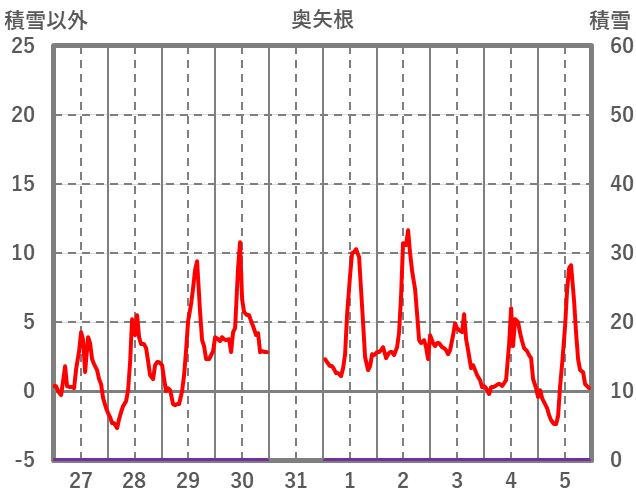 | 日 | 時 | 気温 | 降水 | 風向/風速 | 日照 | 積雪 | 降雪 |