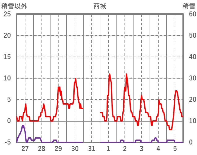 | 日 | 時 | 気温 | 降水 | 風向/風速 | 日照 | 積雪 | 降雪 |