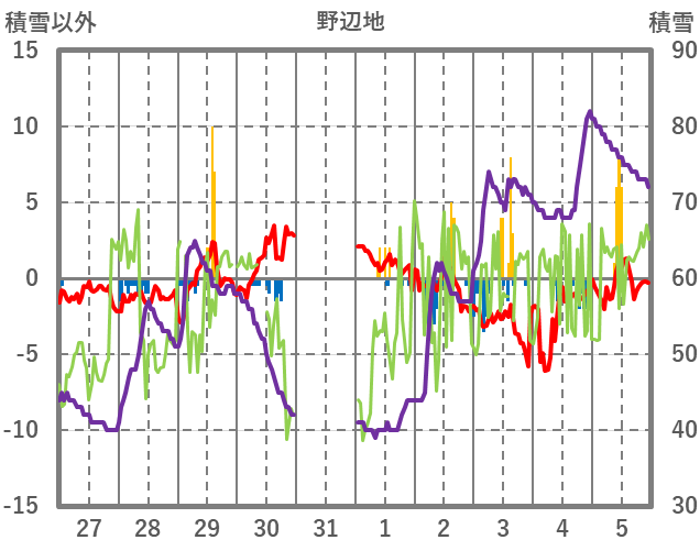 | 日 | 時 | 気温 | 降水 | 風向/風速 | 日照 | 積雪 | 降雪 |