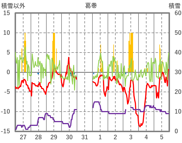 | 日 | 時 | 気温 | 降水 | 風向/風速 | 日照 | 積雪 | 降雪 |