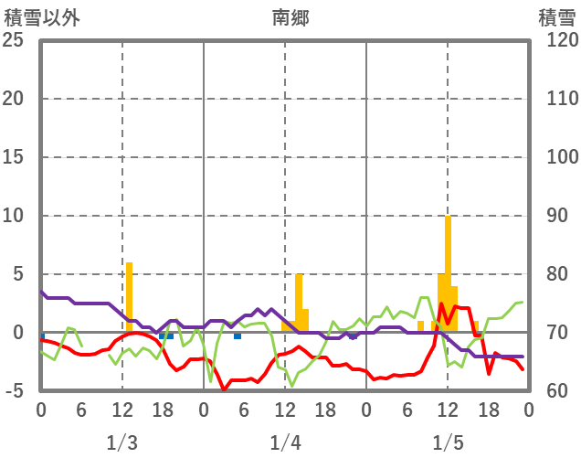 | 日 | 時 | 気温 | 降水 | 風向/風速 | 日照 | 積雪 | 降雪 |