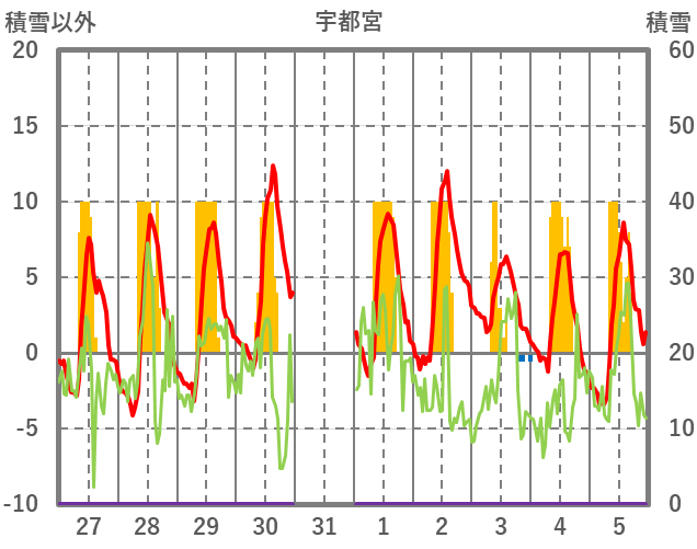 | 日 | 時 | 気温 | 降水 | 風向/風速 | 日照 | 積雪 | 降雪 |