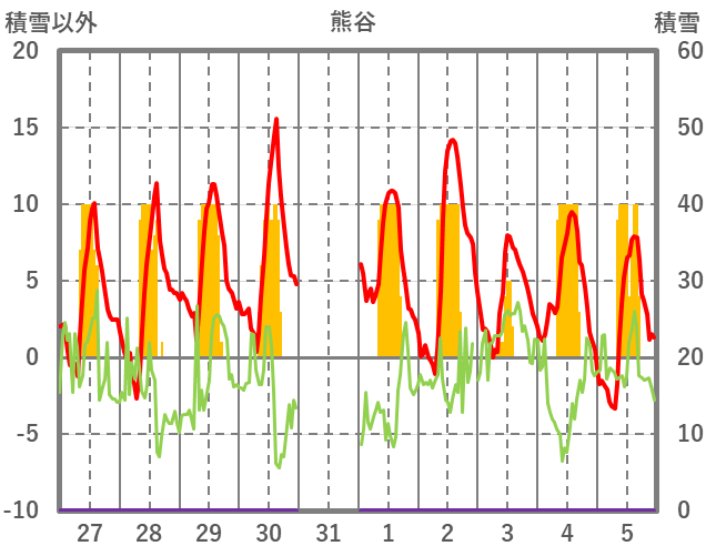 | 日 | 時 | 気温 | 降水 | 風向/風速 | 日照 | 積雪 | 降雪 |