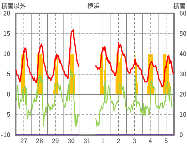 | 日 | 時 | 気温 | 降水 | 風向/風速 | 日照 | 積雪 | 降雪 |