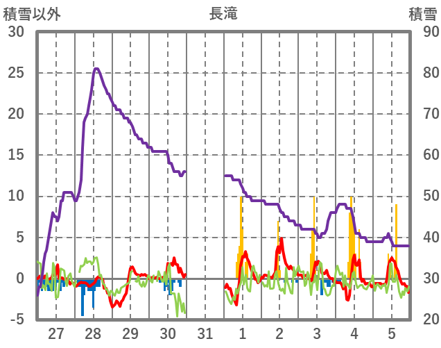 | 日 | 時 | 気温 | 降水 | 風向/風速 | 日照 | 積雪 | 降雪 |