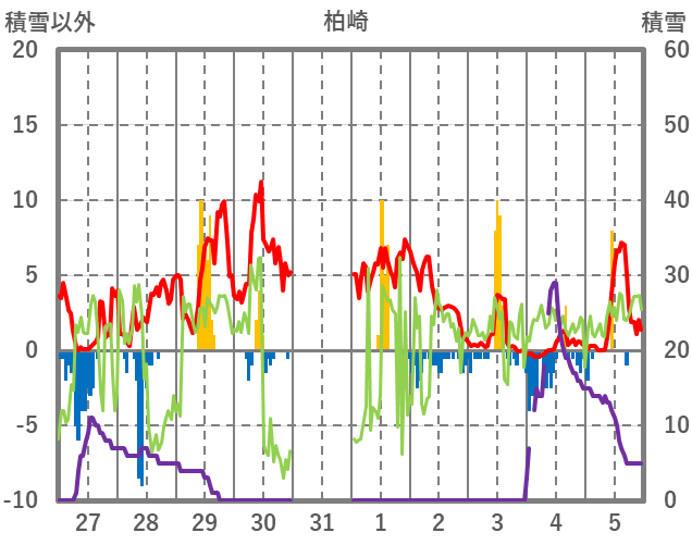 | 日 | 時 | 気温 | 降水 | 風向/風速 | 日照 | 積雪 | 降雪 |