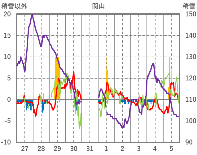 | 日 | 時 | 気温 | 降水 | 風向/風速 | 日照 | 積雪 | 降雪 |