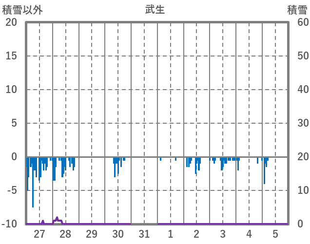 | 日 | 時 | 気温 | 降水 | 風向/風速 | 日照 | 積雪 | 降雪 |