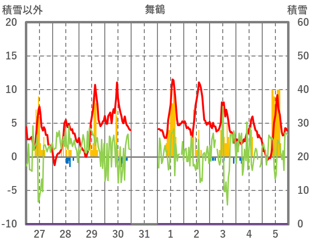 | 日 | 時 | 気温 | 降水 | 風向/風速 | 日照 | 積雪 | 降雪 |