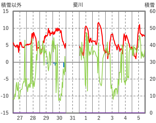 | 日 | 時 | 気温 | 降水 | 風向/風速 | 日照 | 積雪 | 降雪 |