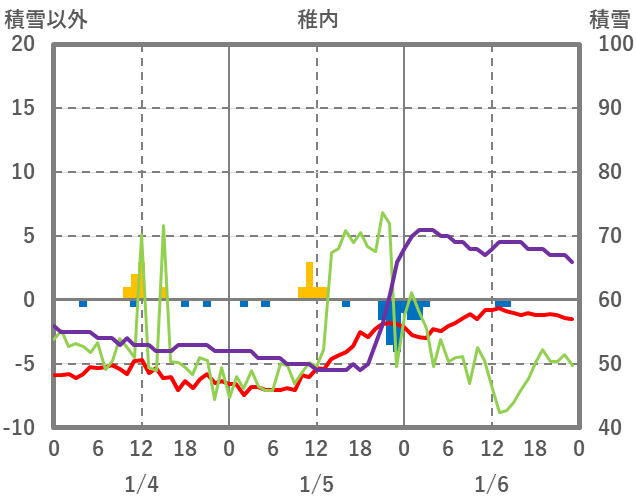 | 日 | 時 | 気温 | 降水 | 風向/風速 | 日照 | 積雪 | 降雪 |