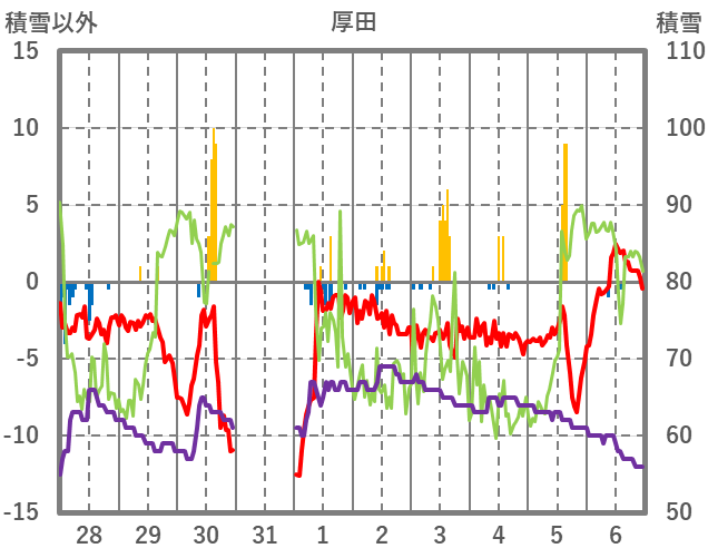 | 日 | 時 | 気温 | 降水 | 風向/風速 | 日照 | 積雪 | 降雪 |