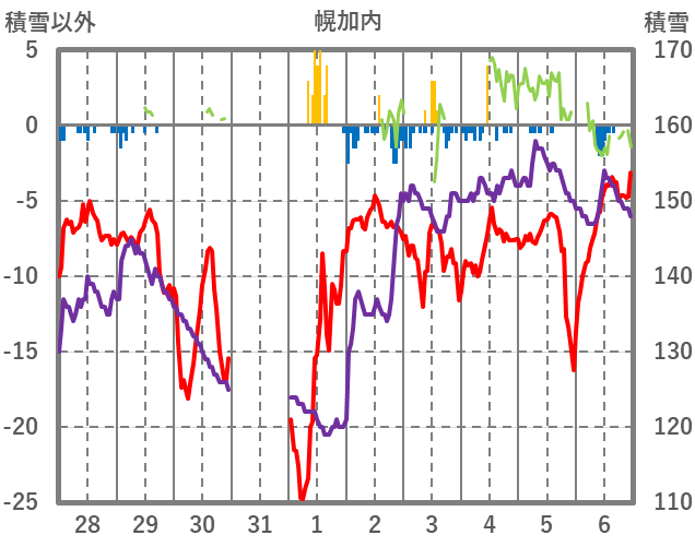 | 日 | 時 | 気温 | 降水 | 風向/風速 | 日照 | 積雪 | 降雪 |