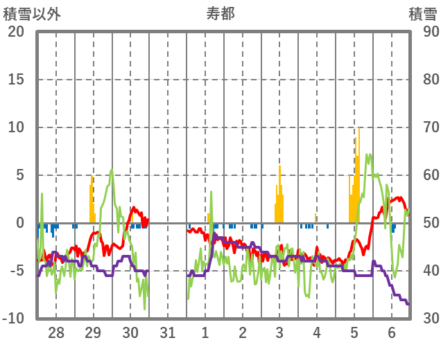 | 日 | 時 | 気温 | 降水 | 風向/風速 | 日照 | 積雪 | 降雪 |