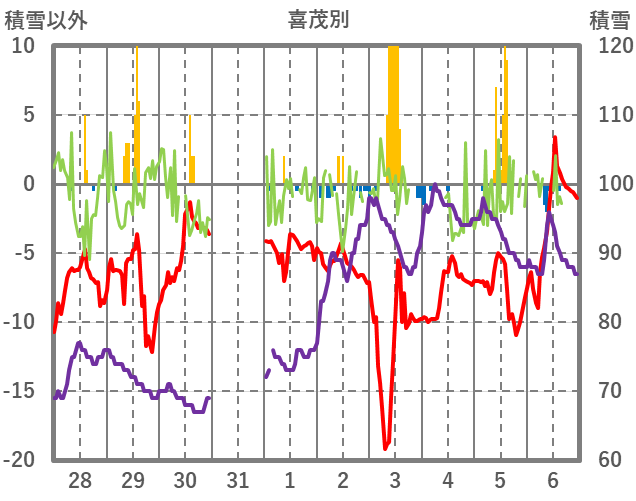 | 日 | 時 | 気温 | 降水 | 風向/風速 | 日照 | 積雪 | 降雪 |