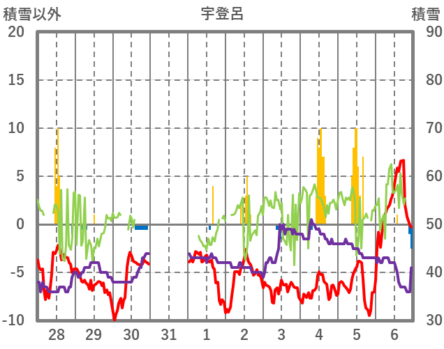 | 日 | 時 | 気温 | 降水 | 風向/風速 | 日照 | 積雪 | 降雪 |
