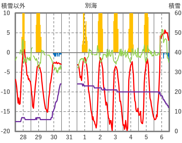 | 日 | 時 | 気温 | 降水 | 風向/風速 | 日照 | 積雪 | 降雪 |