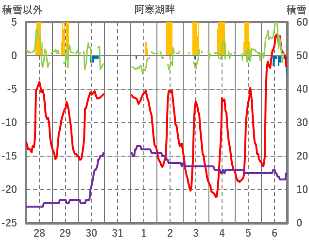 | 日 | 時 | 気温 | 降水 | 風向/風速 | 日照 | 積雪 | 降雪 |