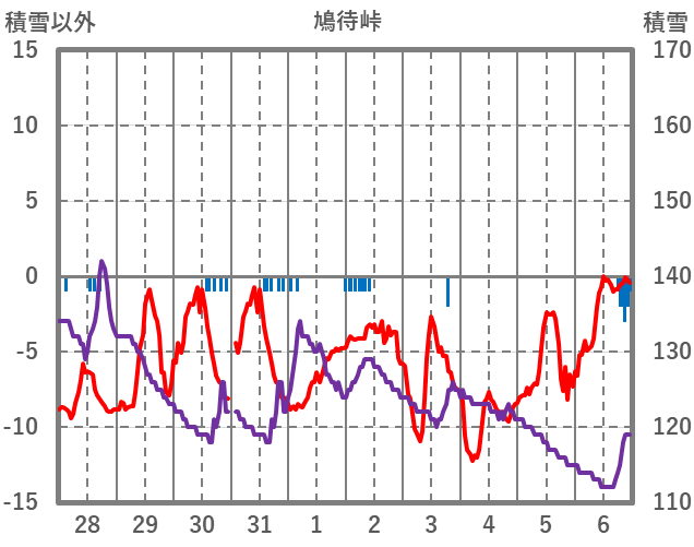 | 日 | 時 | 気温 | 降水 | 風向/風速 | 日照 | 積雪 | 降雪 |