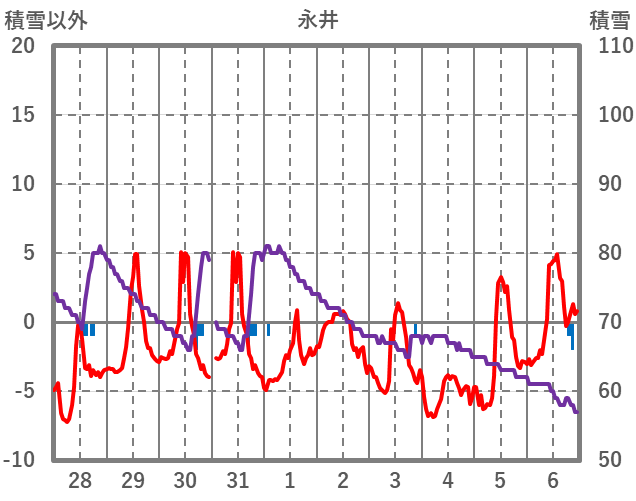 | 日 | 時 | 気温 | 降水 | 風向/風速 | 日照 | 積雪 | 降雪 |