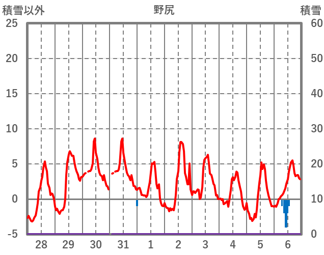 | 日 | 時 | 気温 | 降水 | 風向/風速 | 日照 | 積雪 | 降雪 |