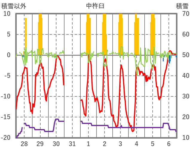 | 日 | 時 | 気温 | 降水 | 風向/風速 | 日照 | 積雪 | 降雪 |